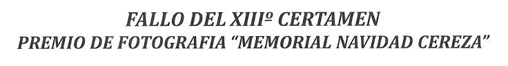 Fallo del XIII CERTAMEN PREMIO DE FOTOGRAFÍA “MEMORIAL NAVIDAD CEREZA” Whatsapp: Fallo del XIII CERTAMEN PREMIO DE FOTOGRAFÍA “MEMORIAL NAVIDAD CEREZA” Fecha 14 noviembre 2024 Documentos MEMORIAL NAVIDAD CEREZA 2024.pdf (pdf 2,1 MB)